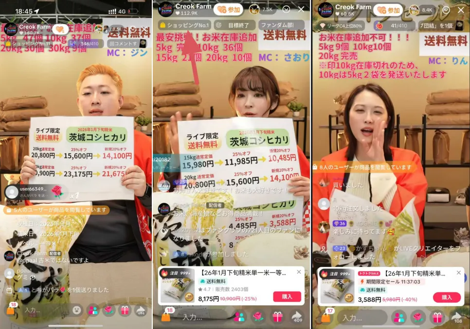 而在这些主流品类之外,TikTok日本站近期却意外跑出了一匹品类黑马——食品品类,其中细分类目“大米”更是率先异军突起成为食品赛道的“明星商品”。据TK观察了解,日本TikTok最大直播基地CREOK FARM的官方账号@creok.farm,近日创下了连续3场直播同时在线人数突破8400人、3天累计销售额超1280万日元的亮眼成绩。从直播运营策略上看,该账号沿用了国内成熟的“直播限定”打法,主打“20kg茨城县越光米仅售15600日元,新用户14100日元”的限时优惠,吸引了大批本就对大米有即时需求的日本用户的关注,成功推动这款传统商品在TikTok内容电商平台实现销量突围。