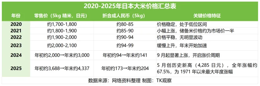 梳理日本近五年大米零售价格走势,可以清晰看出其大米价格呈逐年持续攀升态势,2025年更是一举创下历史新高,全年涨幅约67.5%,这一涨幅也成为日本1971年以来的最大年度涨幅。目前日本线下商超中,5kg装普通精米的市场平均售价约4300-4500日元,折合人民币约210-230元;而部分主打本土高品质的高端品牌,同款规格大米的售价更是居高不下,部分品类甚至突破5000日元(250元)。