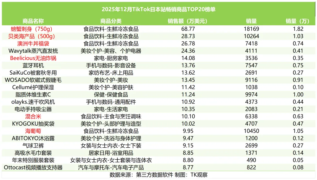 根据第三方数据软件显示,2025年12月TikTok日本站畅销商品TOP20榜单中,食品饮料表现超乎预料,榜单前三席均被其包揽;若将厨房用品也纳入统计,则食品相关品类共6款产品跻身榜单,占比高达三成,这一数量已超越常规畅销榜的“常客”—美妆个护、女装以及数码3C,再次印证了食品类商品在TikTok日本站的高人气与市场认可度。