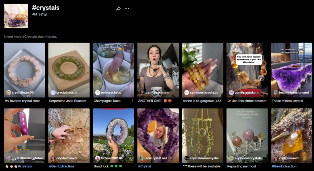TikTok 上带有 #crystals(水晶)标签的视频超 410 万条,单条视频观看量高达几百万,观看量高达 62 亿次。
