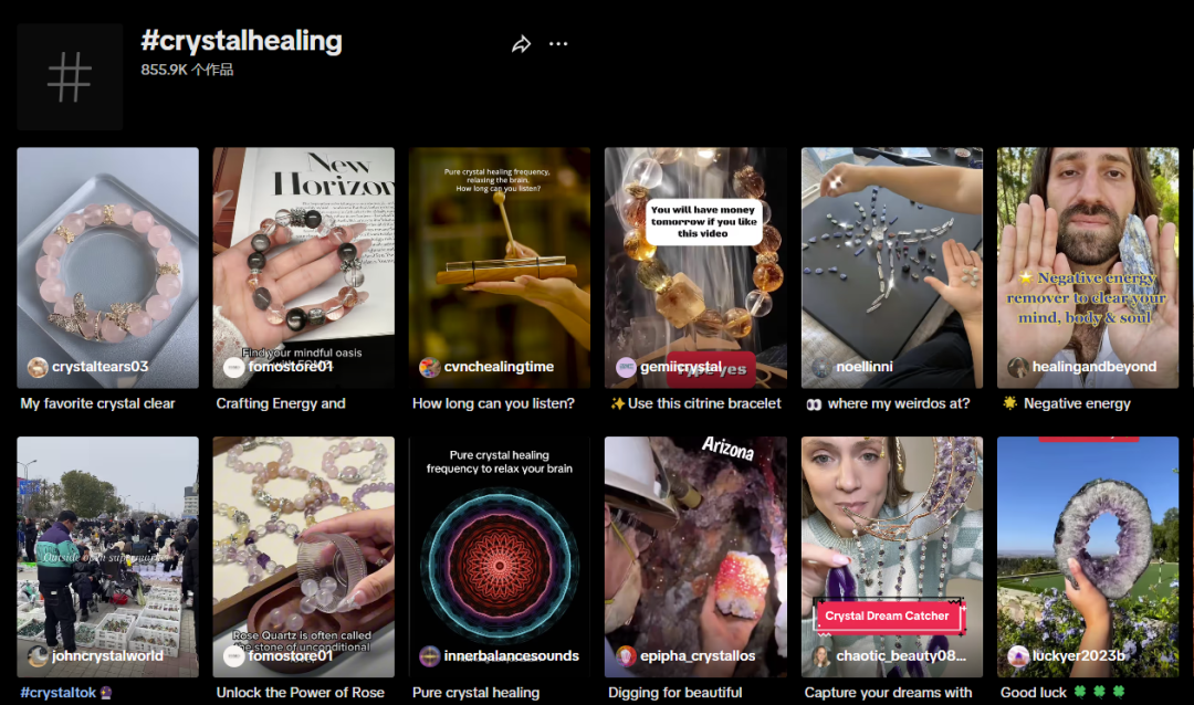 Tiktok、Instagram 等社交媒体平台上有许多海外网友分享“水晶能量”视频,介绍不同水晶的特点和功效,以及如何选择适合自己的水晶饰品,为水晶疗愈的传播提供更大的曝光。