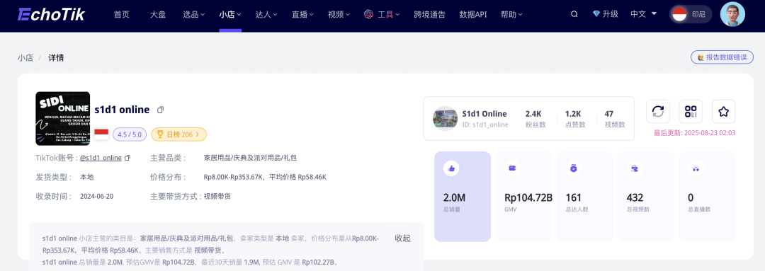 据Echotik数据显示,这家印尼TikTok小店s1d1 online(@s1d1_online),总计售出200万件单品,大部分的销量来自近半个月,近15天售出190多万件,这个销量基本是在2天内实现的。