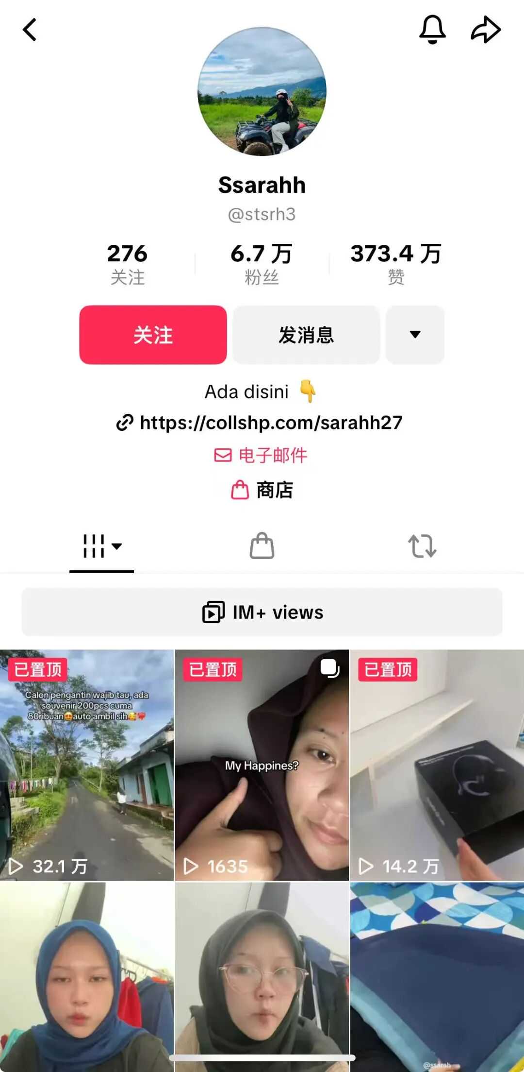 部分销量来自于带货达人的爆款视频。比如一个来自印尼的小型达人Ssarahh(@stsrh3),尽管粉丝量只有6.7万个,但是一个置顶的爆款视频实现了32万多次的播放量,有效带动了这家印尼TikTok小店婚礼用品的销售。