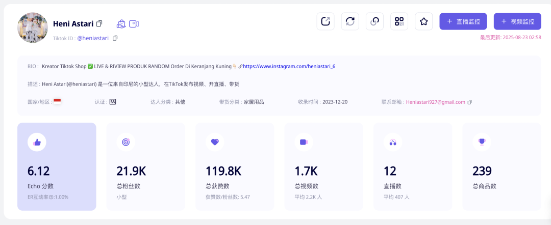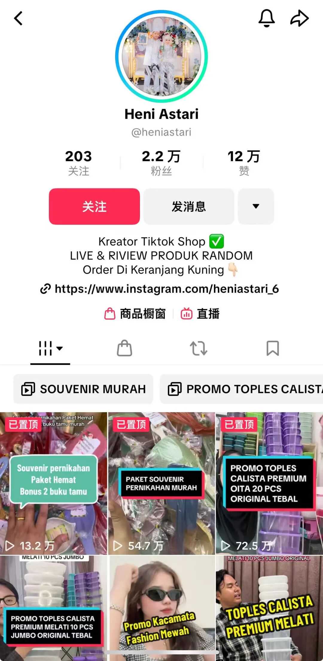 另一个带货达人Heni Astari(@heniastari)也是印尼TikTok的小型达人,拥有2.2万个粉丝。