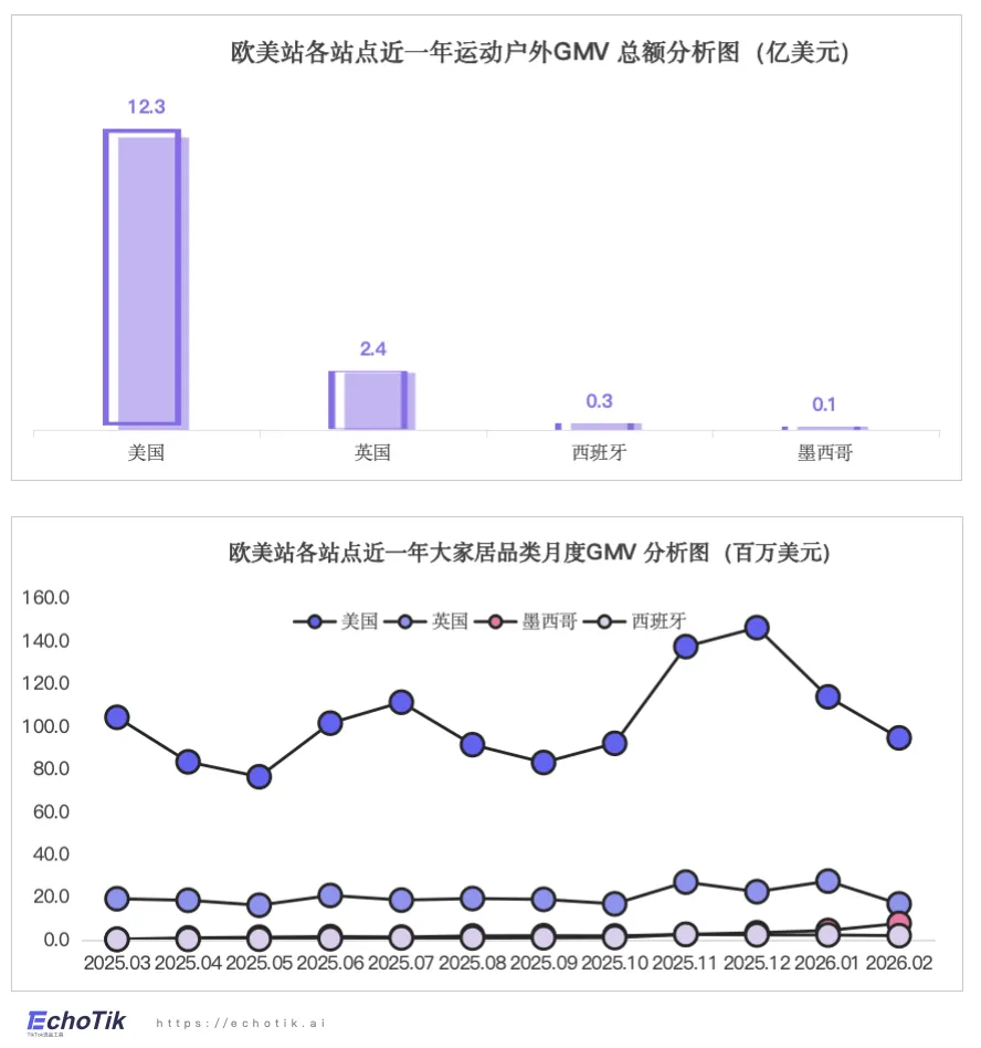 泰国以超4.7亿美元的GMV,领跑东南亚市场的运动户外类目。从月度走势看,从25年第四季度开始,运动户外类目呈现强劲上升趋势。