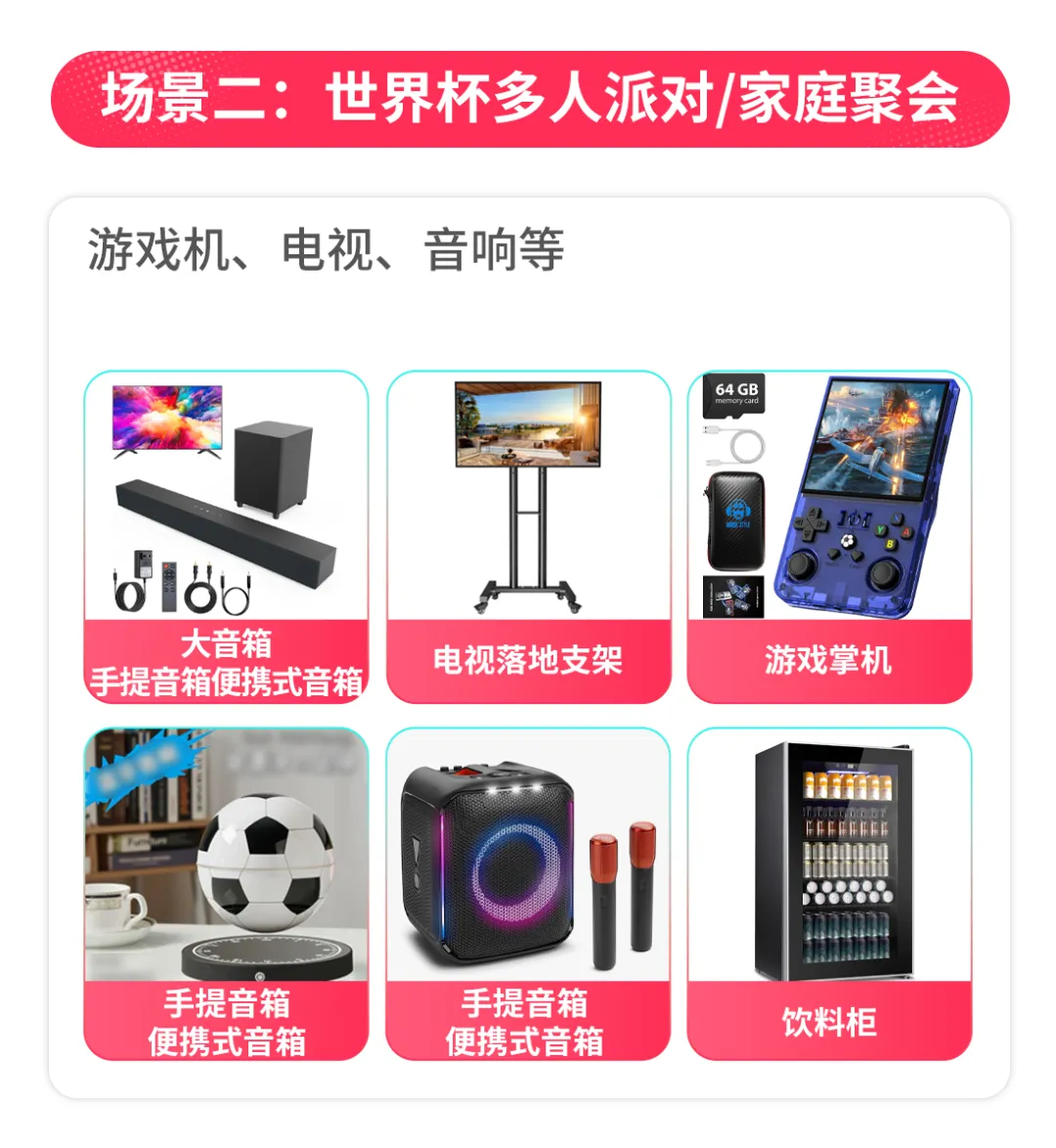把握春夏户外出游、世界杯多人派对/家庭聚会、夏季制冷设备应季趋势品类: