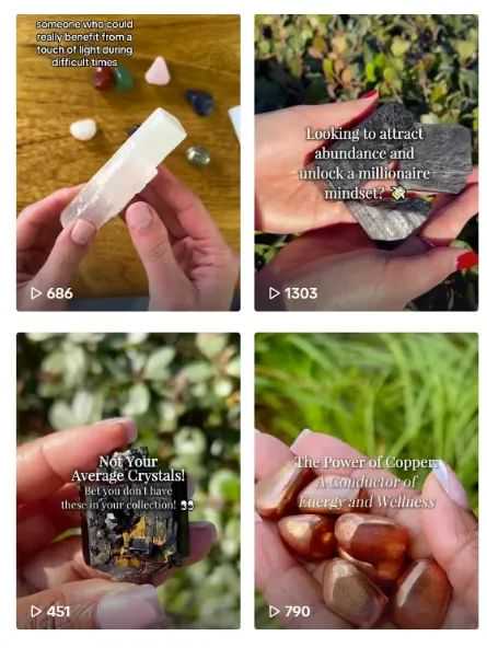 另外还有一个热门品类是水晶类产品。在TikTok上,创作者通过对比鉴别技巧、分享冥想教程、讲述佩戴故事等多元形式,激发全球用户互动热情,让水晶成为热门商品。以品牌 Energy Muse 为例,其将中国铜钱、玉石、风水元素融入水晶设计,logo 借鉴八卦造型,凭借多元文化创意,在 TikTok 收获大量粉丝,成为水晶品类大卖品牌。