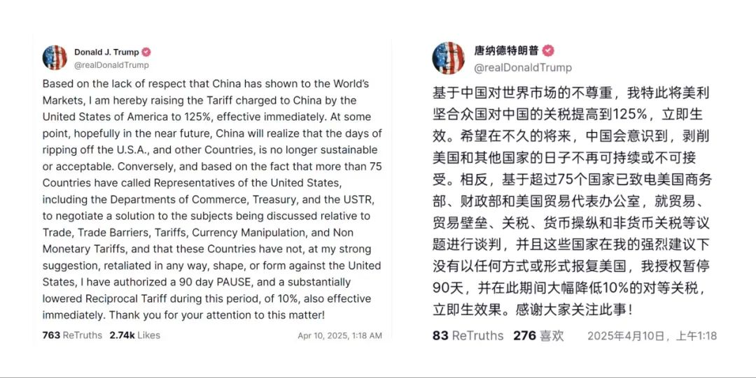 美国东部时间 2025 年 4 月 9 日(北京时间 4 月 10 日)凌晨,特朗普通过其个人社交平台发布了一则爆炸性消息:美国决定对原产于中国的进口商品关税提高到 125%,并宣布政策立即生效。