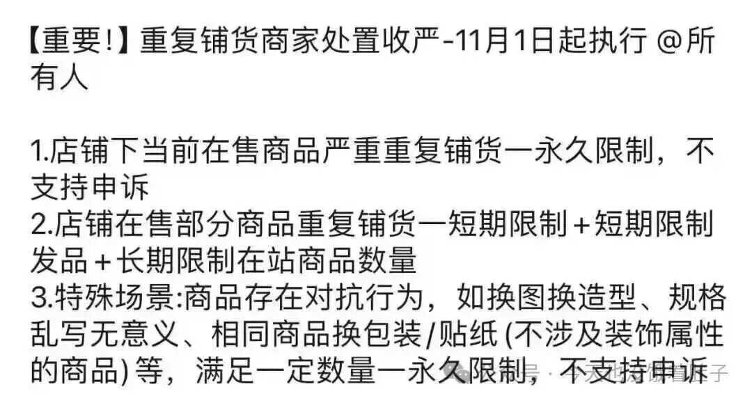 旺季前夕,Temu 的一则新规在卖家圈掀起轩然大波:被明令禁止已久的重复铺货行为正式进入“严抓期”,11 月 1 日起处置规则将正式落地,严重者将永久封店。