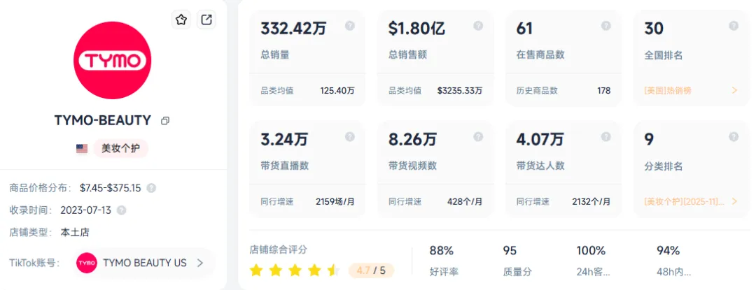 截至 2025 年末,TYMO BEAUTY 品牌在 TikTok Shop 美区的销售额共计达到 1.8 亿美元,总销量为 332.42 万件,实力不可小觑。