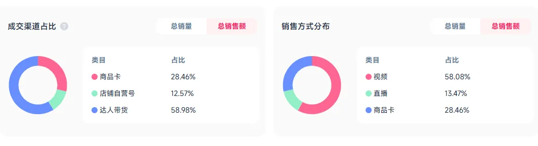 另外,在近期的渠道占比中可以看到,在总销售额占比中,达人与店铺自营达到了七成以上,是品牌营收的主要来源。