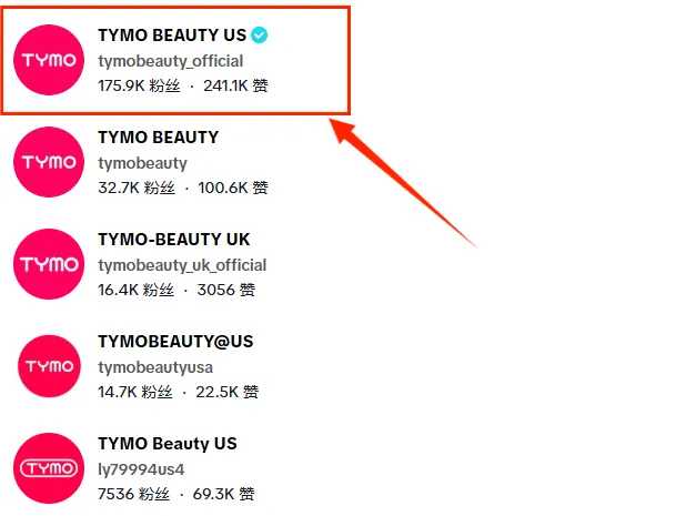 先从品牌自营端展开分析,TYMO BEAUTY 品牌在 TikTok 上所采取的是多账号矩阵布局,目前可查询到的账号共有 5 个,涵盖视频号、直播号等不同职能。