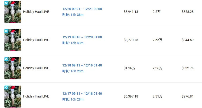 如下图所示,在年终大促期间,@tymobeauty_official 的直播间几乎达到了每一日的连续覆盖,单场直播时长均超过 14 小时,形成了持续的品牌曝光与销售热度。