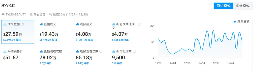 数据显示,从 11 月 29 日到 12 月 28 日期间,品牌自营账号 @tymobeauty_official 成交金额达到了 27.59 万美元,其中直播成交为 19.43 万美元,足以可见这种轮播模式的效果。