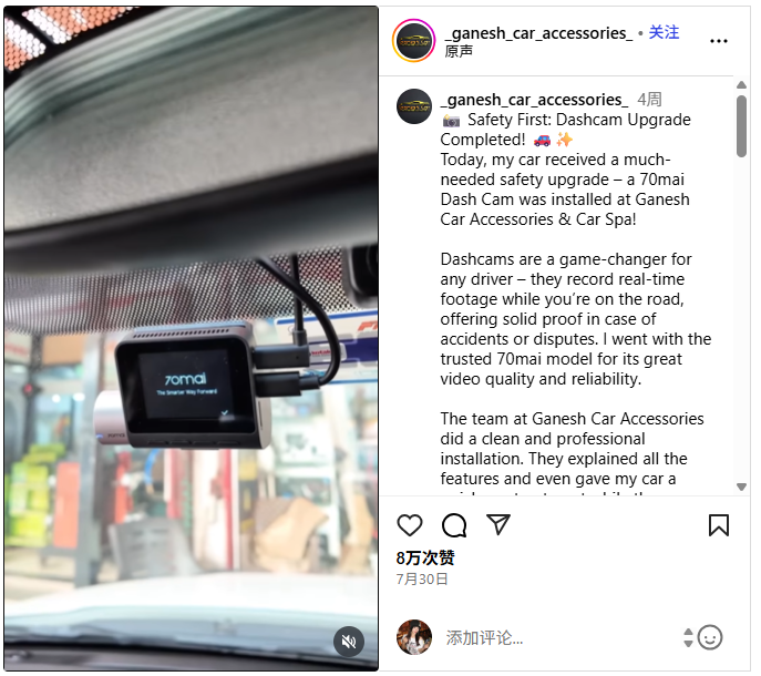 海外用户买行车记录仪,常犯愁 “不会装怎么办”。70mai 找的 @_ganesh_car_accessories_这类 “汽车配件店老板”,正好解决了这个痛点。他们的视频里,不仅展示产品,还拍 “怎么调试 APP”。这种 “产品展示 + 安装教学“的内容模式,精准击中了海外用户 “想买但怕麻烦” 的心理,也让汽车配件博主成为 70mai 连接 “线上流量” 与 “线下服务” 的关键纽带。