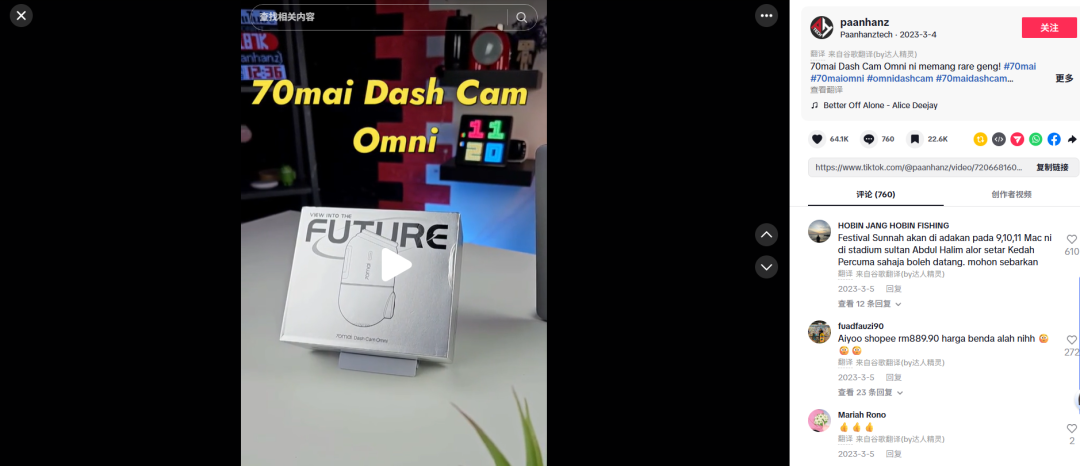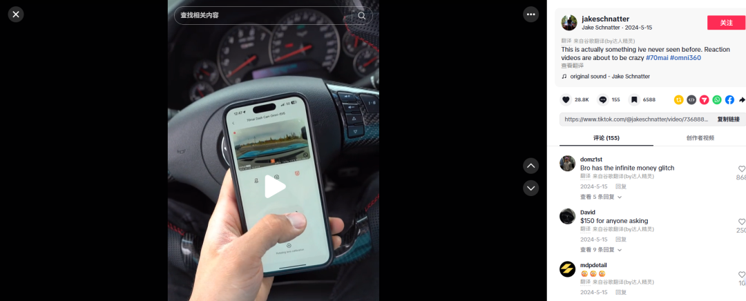 汽车博主 @jakeschnatter 的一条视频里,没有复杂的参数讲解,只镜头对着 70mai Omni 360 全景记录仪,实景应用使这条视频收获 28.8k 点赞,评论区有人留言 “i have 70mai dash cam in all of my cars and absolutely love them”,自发形成二次传播。