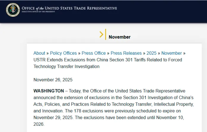 当地时间 11 月 26 日,美国贸易代表办公室(USTR)宣布,将把针对中国技术转让和知识产权问题、依据 301 条款调查所设立的关税的豁免延长至 2026 年 11 月 10 日。