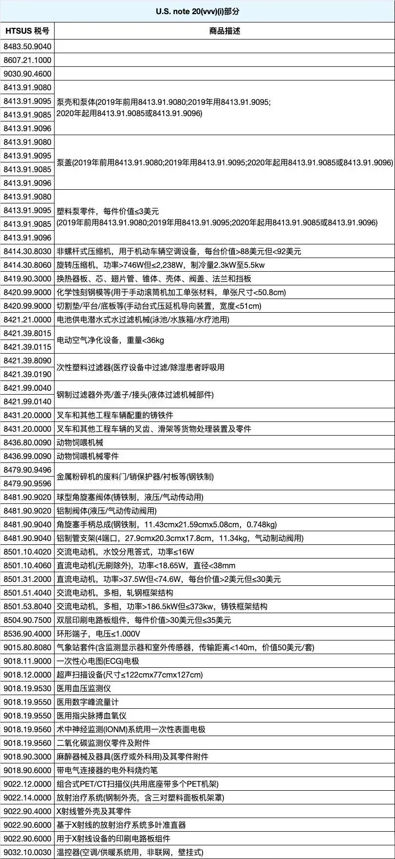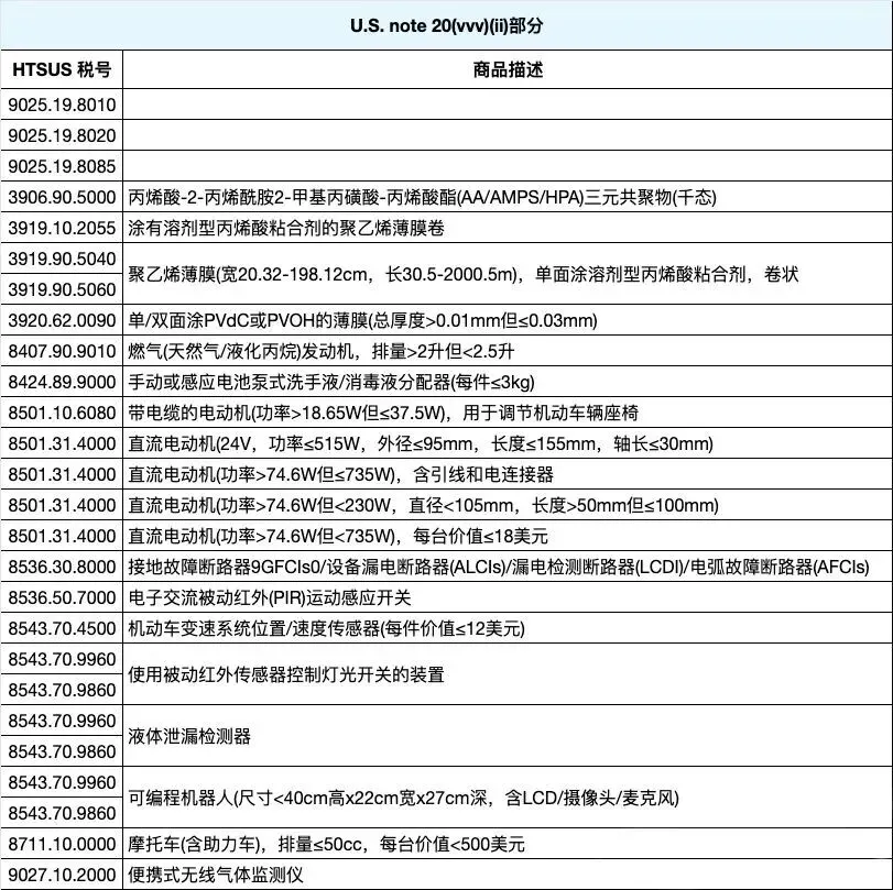 所涉及的税号产品依据 HTSUS 税目 9903.88.69 以及美国注释 U.S. notes 20(vvv)(i)、20(vvv)(ii)、20(vvv)(iii)和20(vvv)(iv)来界定。这些豁免产品种类丰富,包含儿童用品、泵类部件、化工材料、电子元件以及医疗用品等。