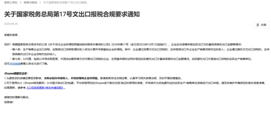 与此同时,速卖通也明确公示了报送的信息范围;Shopee 则要求香港主体卖家在 9 月 29 日前,通过切换大陆主体、香港发货渠道或其他合规方式,确保出口报税合规。另外,对于用 SLS(Shopee 物流服务)从中国大陆出口的包裹,平台将使用卖家进行身份注册/验证时使用的信息,并作为卖家包裹对应的实际生产/销售单位信息进行出口申报。