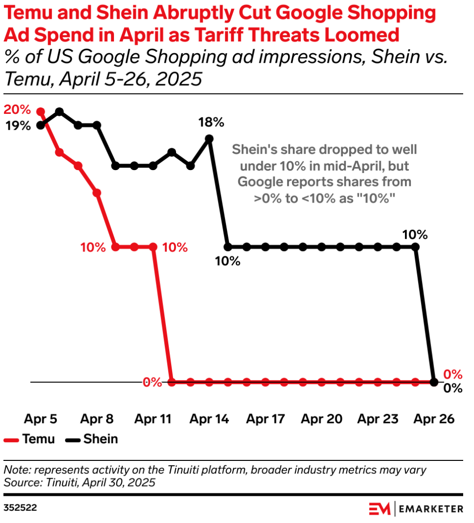 此前,特朗普政府宣布对中国进口商品加征关税,并取消低价值货物的 “最低限度” 免税政策,这对以低价为核心竞争力的Temu构成直接冲击,使其不得不大幅缩减美国市场的广告投入。