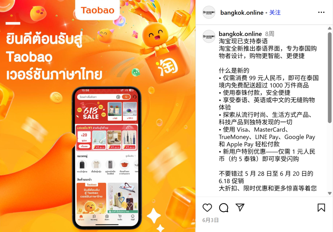 近期,淘宝正式在泰国上线泰语版,支持语言切换以及泰铢结算,这是继在新加坡和马来西亚推出英文版后,淘宝在东南亚本土化运营的又一重大里程碑。据外媒报道,淘宝泰语版本上线一个多月以来,泰国当地新用户数量同比增长近6成;今年 “618 大促” 中,淘宝泰国站服饰、家居、3C 数码类产品销量突出,其中女鞋品类GMV同比增幅超200%。