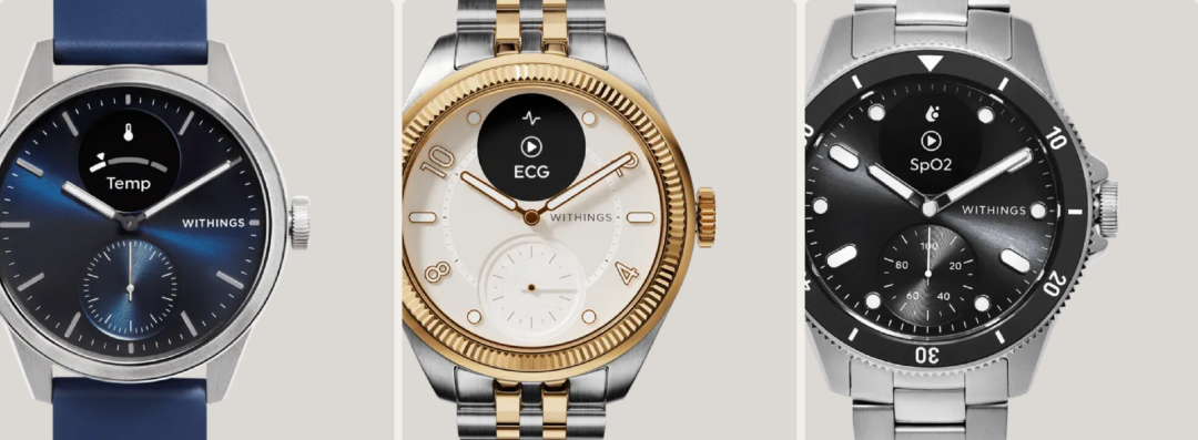 先是推出的混合智能手表Activité,不仅没有跟风做单一运动功能,反而开创了“传统腕表设计+健康追踪”新品类。之后几年,Withings 再度开扩这个品类,推出的 Steel HR Sport 智能手表,靠 25 天长续航解决频繁充电的痛点;ScanWatch 系列也新增了 ECG 与血氧检测,一步步提升了可穿戴设备的日常监测功能。