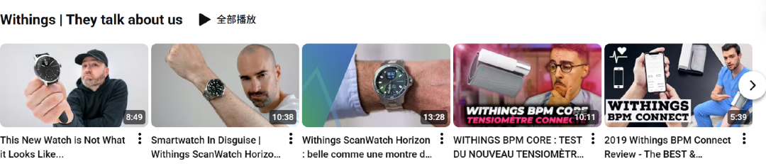 在社媒渠道上,Withings 以 Youtube、Facebook 等社媒平台为主搭建了营销矩阵。根据观察,Withings 的社交营销重点倾向于视频类内容。