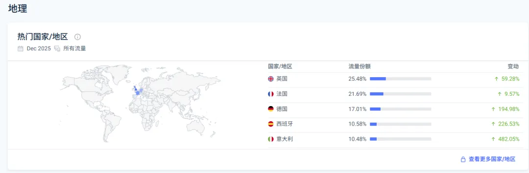 2025 年 1 月的数据显示,SYMINO 品牌独立站的月访问量达 1.7 万次,直接流量占 16.02%,有机搜索流量高达 60.92%。其中,英国、法国和德国位列前三,部分市场份额增长高达 482.05%。