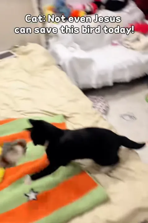 视频文案还配有文案——“猫:就算耶稣来了,也拿这只鸟没办法!”再加上画面,极具喜剧感。