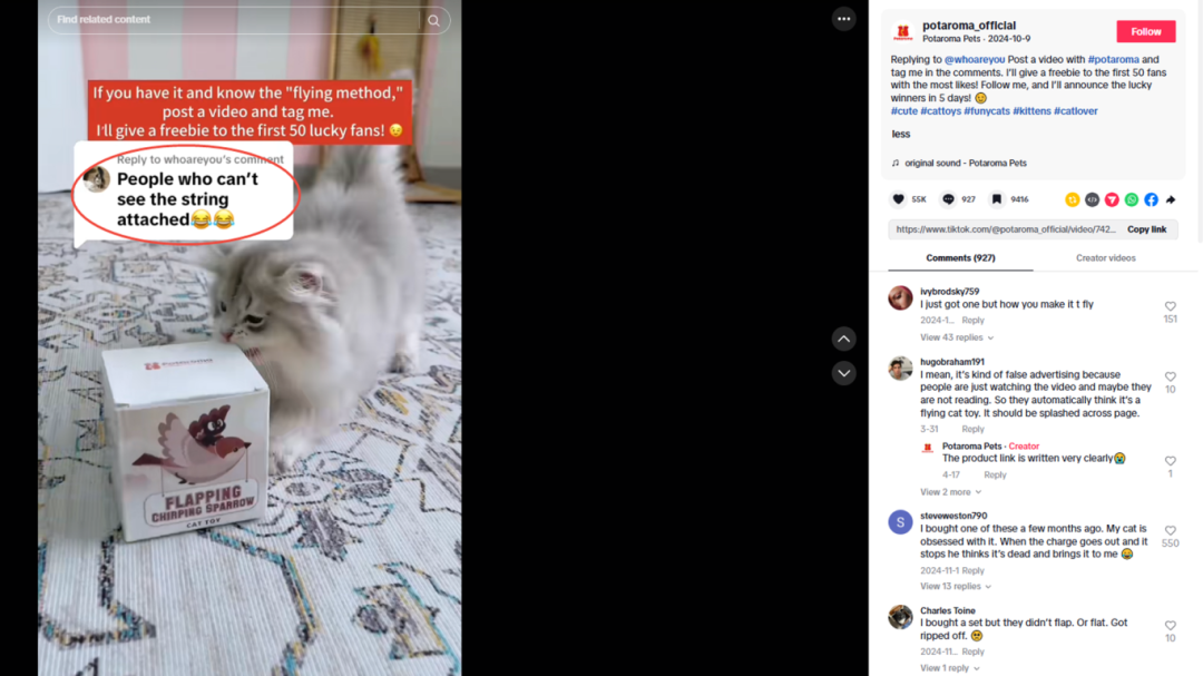 视频中看到,该博主首先展示了从 TikTok Shop 购入的宠物玩具。乍看之下,这只是一个鸟形状的猫咪毛绒玩具,但启动后却令人惊叹不已——这个玩具鸟居然能“飞起来”!它超高的弹跳力和不规则的运动轨迹,把猫咪耍得晕头转向。