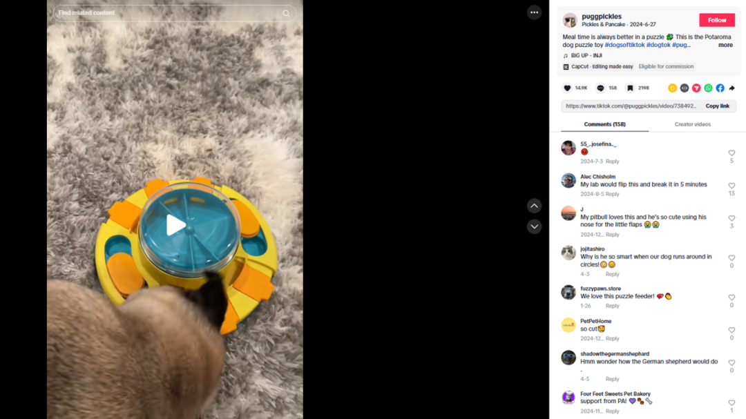 在合作视频中,@puggpickles 通过产品展示为主线,展示了自家狗狗玩 Potaroma 拼图喂食器的日常,让许多铲屎官与宠物爱好者对其萌态心动,既保留了账号原有的生活化风格,又巧妙植入产品功能展示。