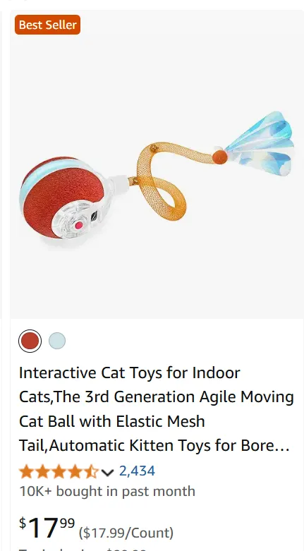 在亚马逊,TKFFF 发现类似功能的球玩具,一款售价 18 美元的同类球玩具在近 30 天内售出了上万单。它与 TikTok 上的热销款功能相似,但在造型、材质和尾部设计上有独特的卖点。