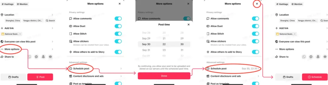 4、支持定时发布:在图文内容编辑页面点击【More Options】,即可找到【Schedule post】按钮→选择期望的发布日期与具体时间,并点击【Done】确认→退出【More Options】页面,完成其他设置后点击【Schedule】,即可成功设定定时发布。