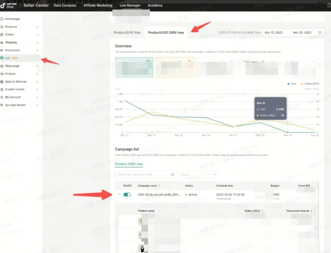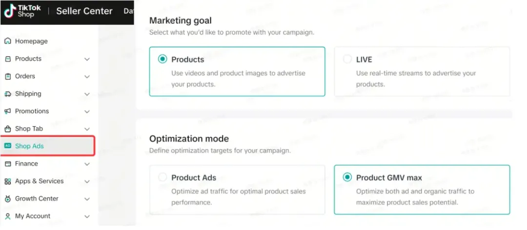 操作步骤:登录用户需要是admin或者有权限访问AdsTab → 登录Seller Center,点击Shop Ads Tab → 点击Createcampaign→创建campaign → Marketing goal - > Select Products → Optimization mode-> Select Product GMV Max