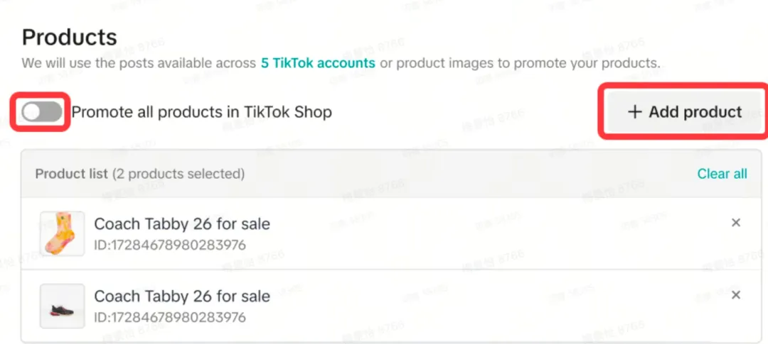 商品选择:可以选择推广店铺中的所有商品,或者从productlist中添加商品;这里可以创建发布的挂车图文内容中包含的挂车商品,如果您选择对全店商品投广,创建过的图文内容也会被投广。