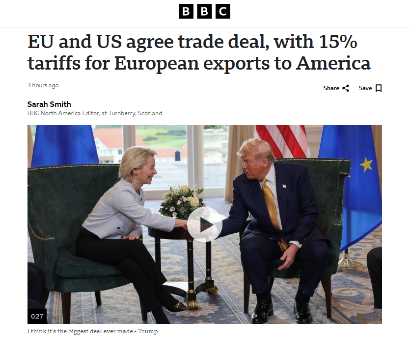 关税砍半至15%!美国欧盟达成贸易协议,欧盟豪掷数千亿买美国货