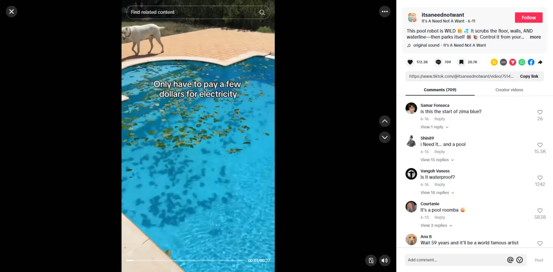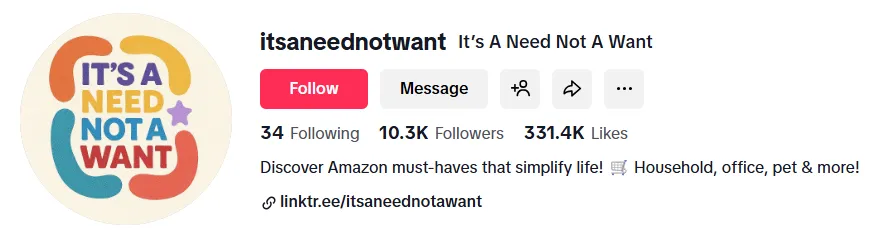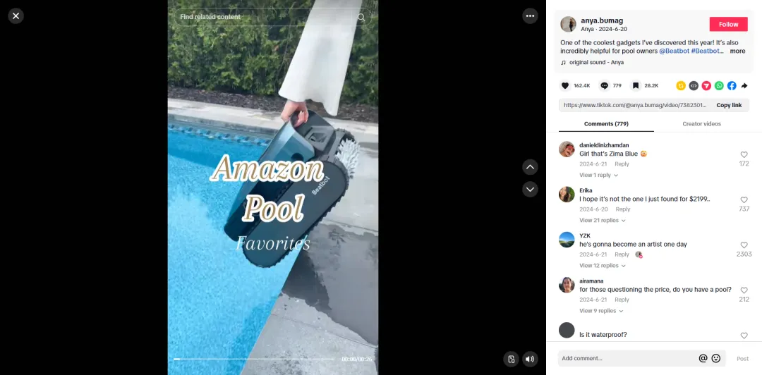 可量化结果:单条视频获得410万播放、172.3k点赞,成功触达全性别中产家庭群体,视频挂载的亚马逊购买链接直接引导转化,形成“场景共鸣-卖点认知-即时购买”的短链路。