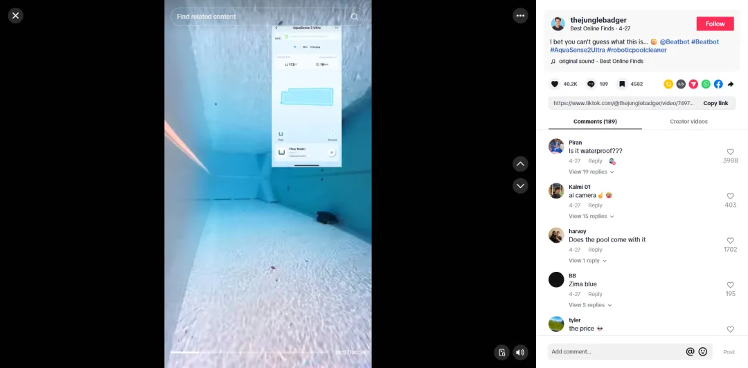 @thejunglebadger粉丝85.3%为18-44岁,男性占比显著,英美受众达76.23%,消费驱动属性强,合作视频以“悬念式开篇”吸引关注,重点拆解AI建图、智能清洁流程;通过开箱、功能测试、效率对比等深度测评,全面展示AquaSense 2 Ultra的AI摄像头、混合感应建图等技术亮点;