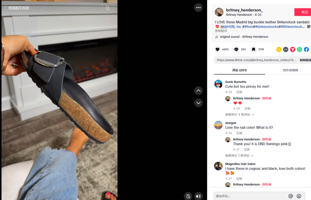 @britney_henderson_是TikTok上一位尾部博主,但她展示勃肯鞋的视频获得了6875个点赞,1719次收藏,评论数达200+条。