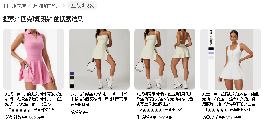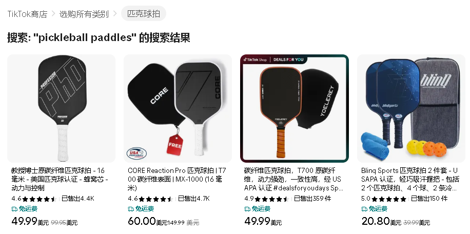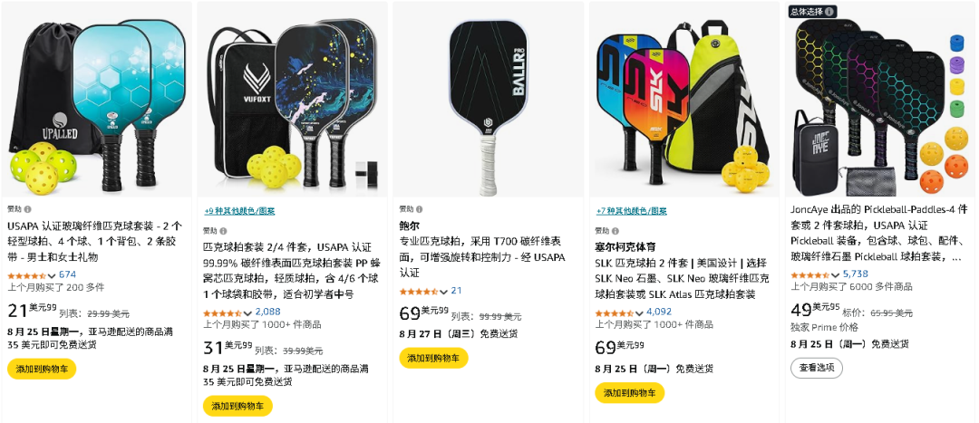 更有意思的是,匹克球的火热不仅在球场上蔓延,也迅速传导到了跨境电商圈。随着匹克球的持续升温,相关装备在全球电商平台上开始热销,球拍、球网、防护装备乃至周边服饰,不断出现在亚马逊、Shopee 以及 TikTok Shop 的畅销榜单上。