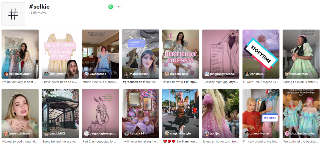 在TikTok上搜索#Selkie,已经有数千万的浏览量。其话题下,有很多创作者用该品牌的裙子来拍摄变装视频。这些视频中,不论是何种族,是何职业的女性,都表示了对Selkie裙子的喜爱。