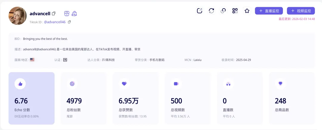 带货量最高的短视频出自一个名叫advancell(@advancell46),粉丝量不超过5000个, 但是这个爆火的视频播放量高达1150多万,一个视频带货2万件,GMV将近19万美金!