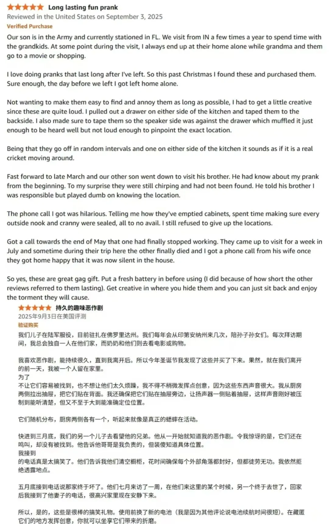这类商品的亚马逊评价都很有趣,恶作剧的人洋洋洒洒写下受害者的抓狂故事,每个人都像个喜剧大师,给予后来人真挚的恶作剧经验。真实的使用评价和其背后有趣的人永远是最让买家信任的。如果你想吸引更多潜在消费者,不妨利用这些用户评论内容作为营销素材。