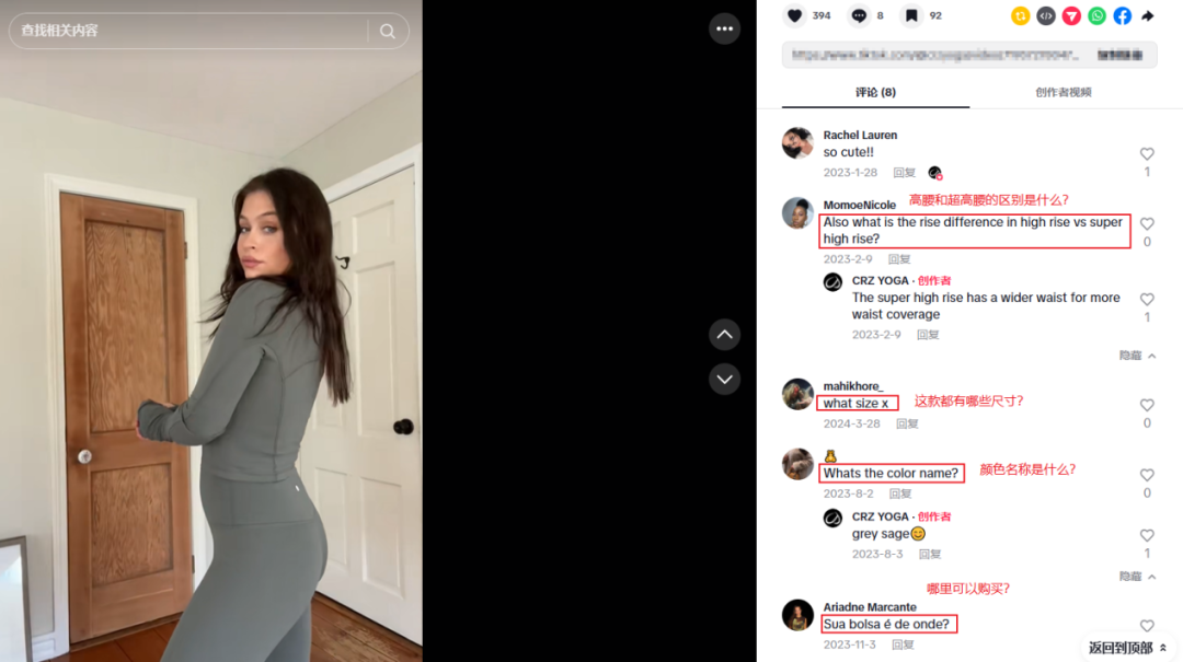 CRZ YOGA 品牌还与 TikTok 平台的中部、尾部达人建立了深度合作,通过展示上身效果来增强说服力。