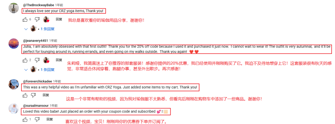 “这是一个非常有帮助的视频,因为我对瑜伽服不太熟悉,但看完后刚刚在购物车中添加了一些商品。谢谢你!”