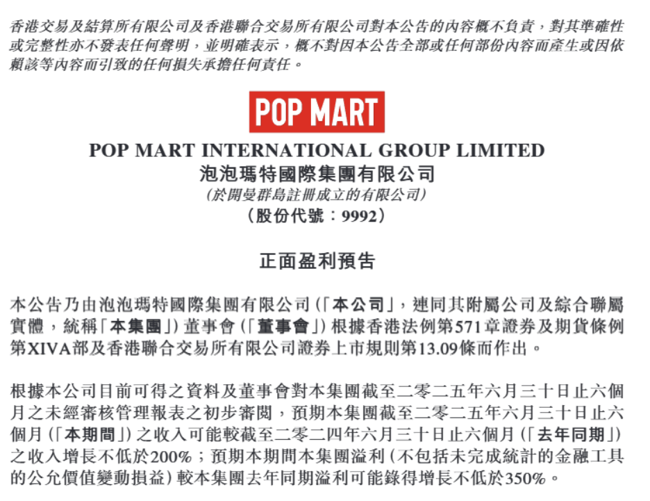 7 月 15 日,泡泡玛特发布业绩预告,预期集团今年上半年收入同比增长不低于 200%,预计溢利同比增长不低于 350%。
