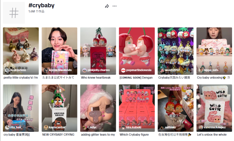 它凭借“哭泣”的形象,精准触达了当下年轻人的情绪需求,在 TikTok 上,crybaby 话题下有超 160 万条视频,其中 32% 都包含 “压力释放” 相关内容;