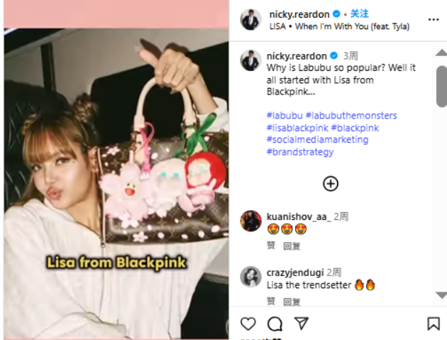 在明星联动方面,Crybaby 采取了分层策略。头部明星如顶流 Lisa 引爆声量,中腰部的素人拆盒博主则维持着长尾传播,形成持续热度。