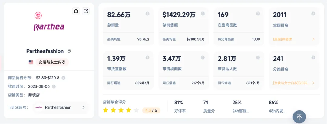 同时,Parthea 品牌 75% 的销量来自短视频——说明 Parthea 已经深刻适配 TikTok 的传播逻辑,让产品在内容中“自然长红”,让内容成为品牌的核心驱动。