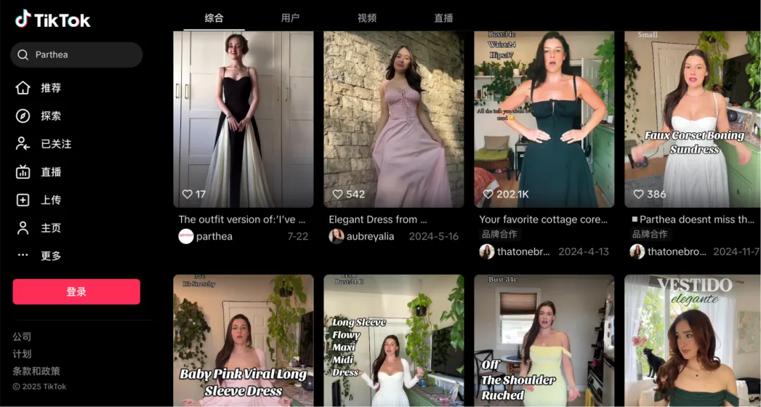 随着大量达人加入,Parthea 的短视频内容在平台上形成规模化扩散,而礼服天然具有镜头优势,因此品牌能靠大量自然流量实现滚动增长,形成真正的数据飞轮。